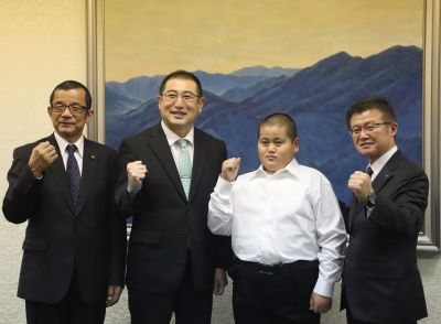 東京国技館で11月30日に開催の「第38回全日本小学生相撲優勝大会」へ出場する飯尾敷地小学校5年生の新居理恩君が市役所を訪問し